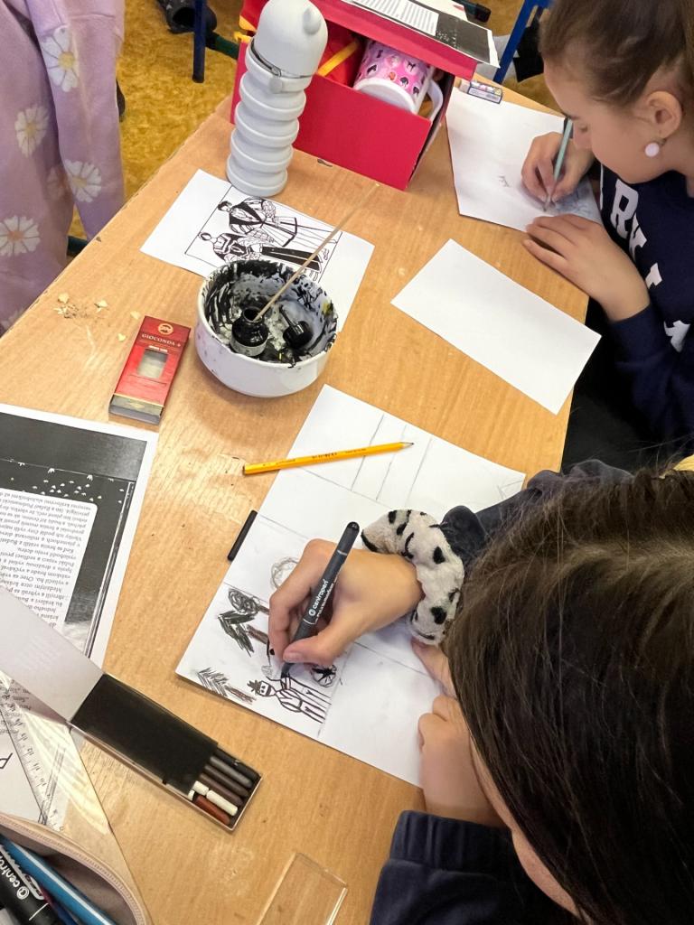 Posledný marcový deň mali milovníci umenia, učitelia i naši žiaci možnosť v priestoroch školy navštíviť výstavu umeleckých prác zameranú na ilustráciu. Jej autorom nebol nikto iný ako náš rodák, Mgr. Jozef Pobočík ml. Ten je známy nielen ako výtvarník, učiteľ Základnej umeleckej školy Imra Weinera Kráľa v Považskej Bystrici a ilustrátor, ale i zručný rezbár a výrobca zvukových nástrojov, píšťaliek a fujár. Tohto všestranného človeka sme mohli navyše v tento deň privítať i na hodinách literatúry. Vďaka jeho ochote sa naši žiaci oboznámili práve s ilustráciou, s procesom jej vzniku, technikami a kritériami, akým by mala hodnotná ilustrácia podliehať. Pod jeho vedením sa každý žiak mohol stať aspoň na malú chvíľku skutočným ilustrátorom. Následne zo žiackych prác vznikla nie menej hodnotná výstava umeleckých prác.