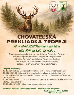 Dňa 18.-19.4.2026 sa v estrádnej sále kultúrneho domu Papradno uskutoční chovateľská prehliadka trofejí so začiatkom od 8.00 do 16.00 hodiny.