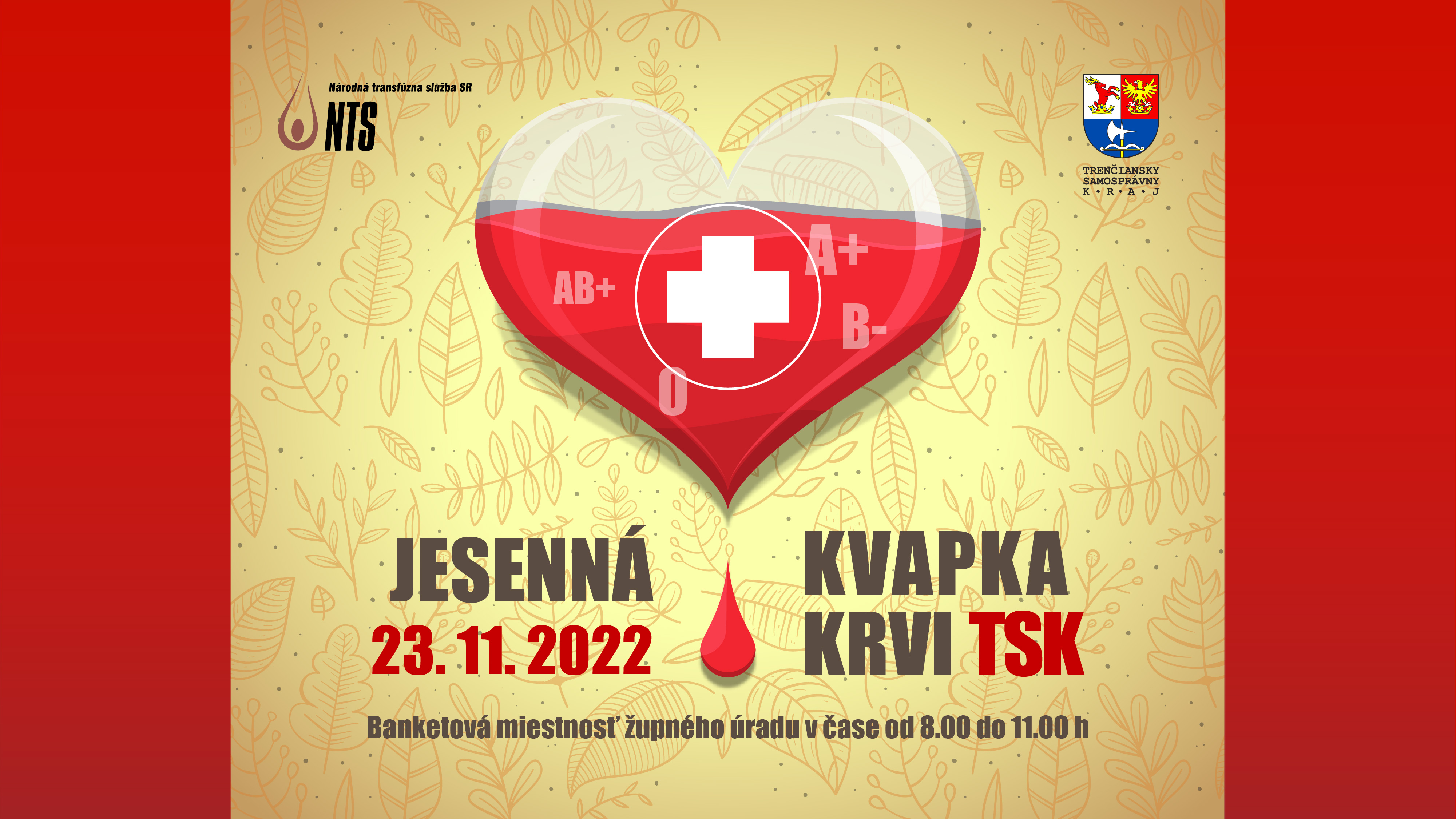 V priestoroch Úradu Trenčianskeho samosprávneho kraja sa v stredu 23. novembra uskutoční v poradí druhý tohtoročný výjazdový odber krvi. V spolupráci s Národnou transfúznou službou (NTS) a tromi župnými nemocnicami Vás pozývame na Jesennú kvapku krvi TSK.