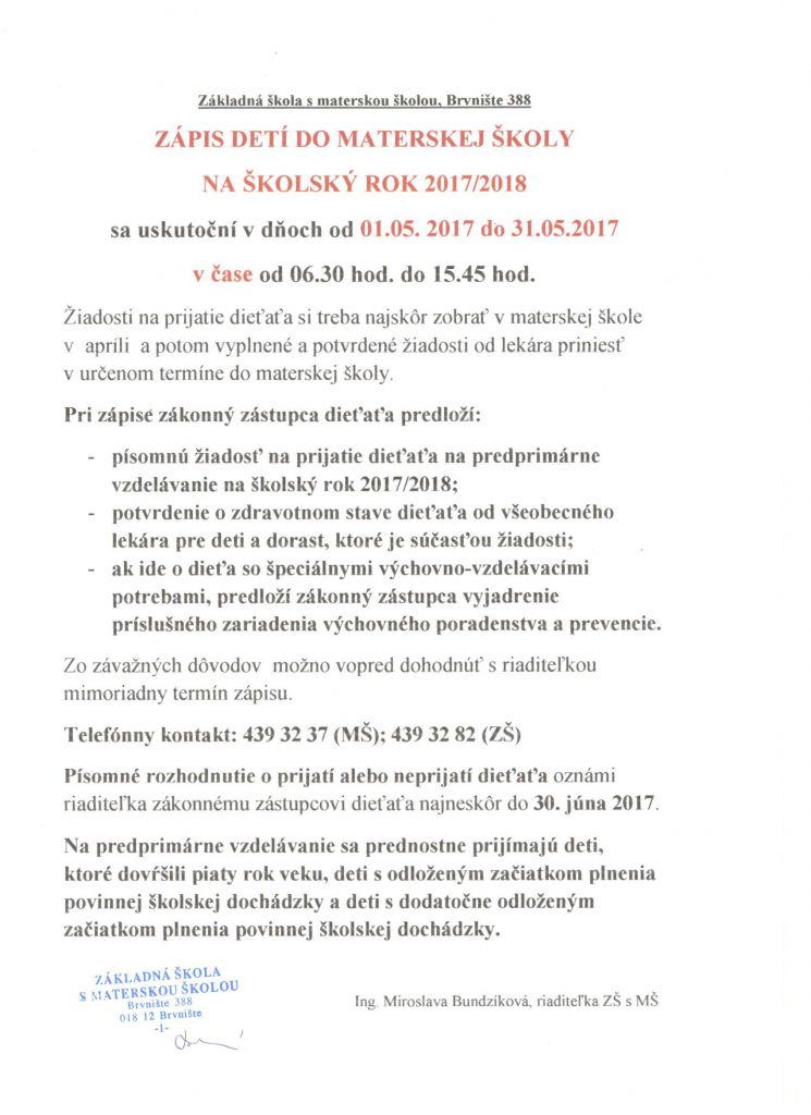 Zápis detí do MŠ na šk.rok 2017/2018