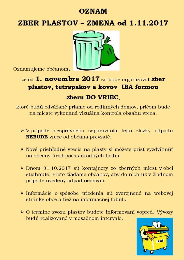 zmena formy zberu plastov,tetrapakov a kovov - iba formou zberu do vriec - od 1.11.2017